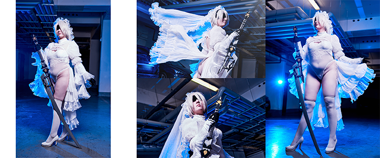 Cette version de 2B issue du jeu NieR: Automata est un fan art unique. La tenue du personnage est une robe de mariée confectionnée sur mesure.